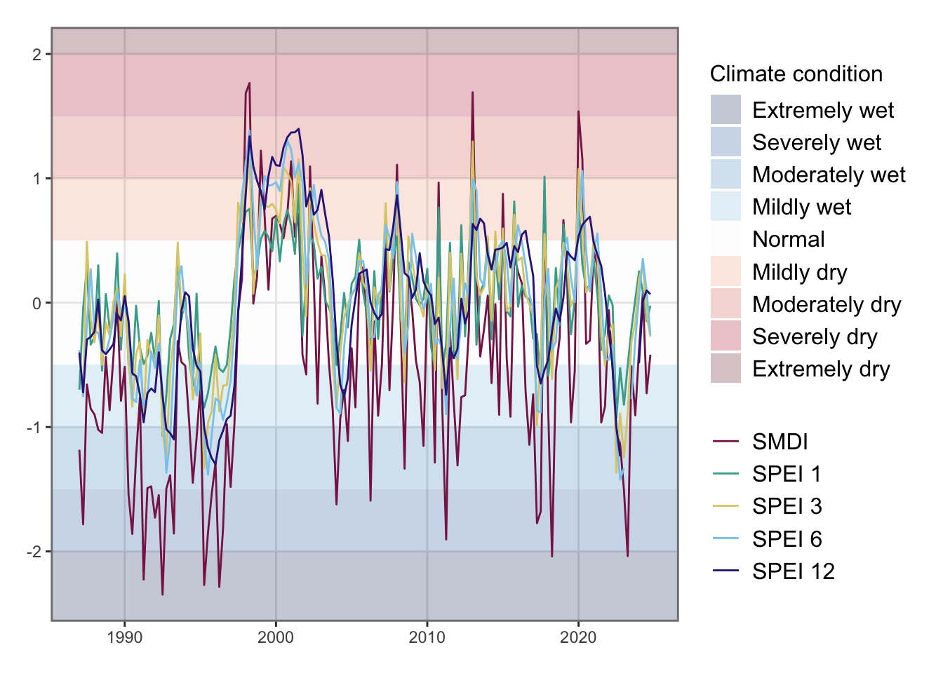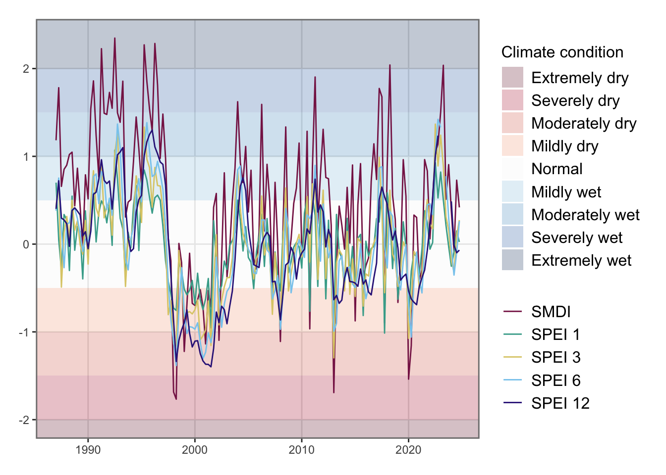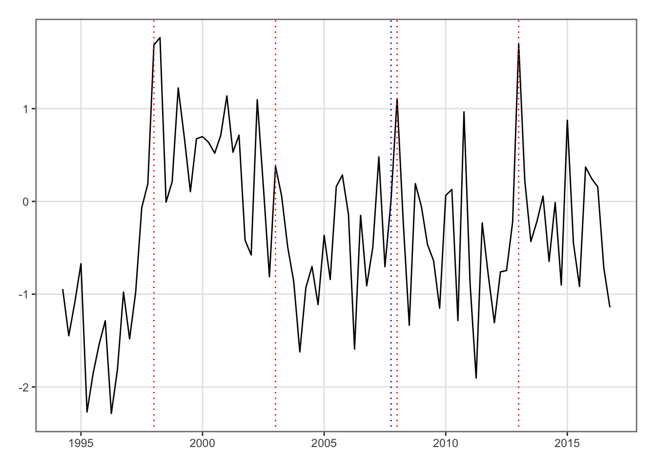 Negative values of the Soil Moisture Deficit index depict droughts (see Figure 6.6 ). In the impulse response functions, we will impulse positive standard deviation shocks. To depict a shock corresponding to a increase in dryness, we change the sign of the SMDI variable (see Figure 6.7).