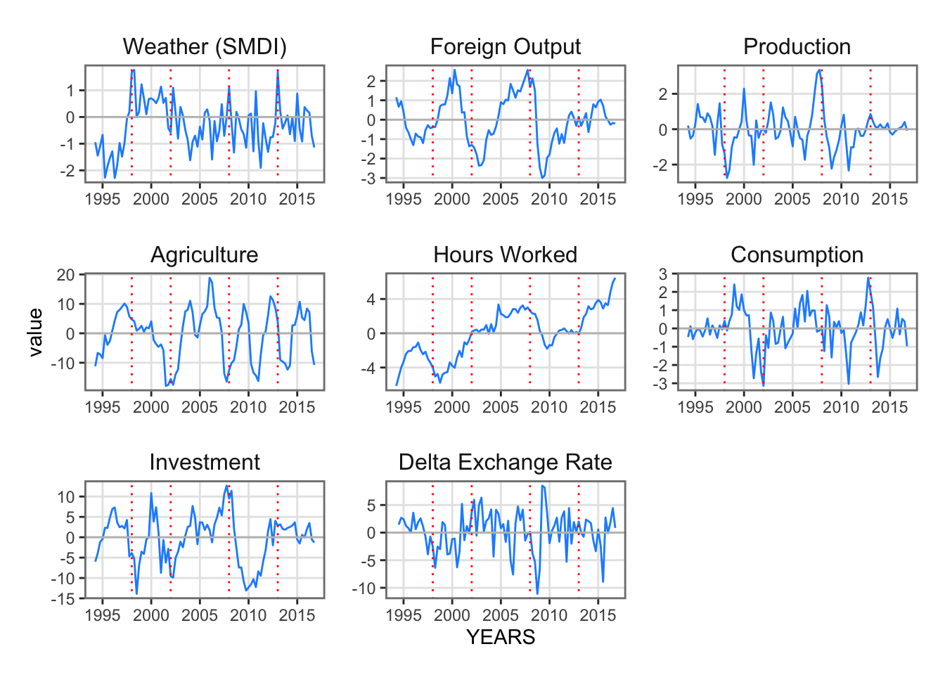 In this page, three types of data are merged into a single dataset that will later be used to analyze the response of the economy to a weather shock, using both a VAR model (Chapter 8) and a DSGE model (Chapter 10).