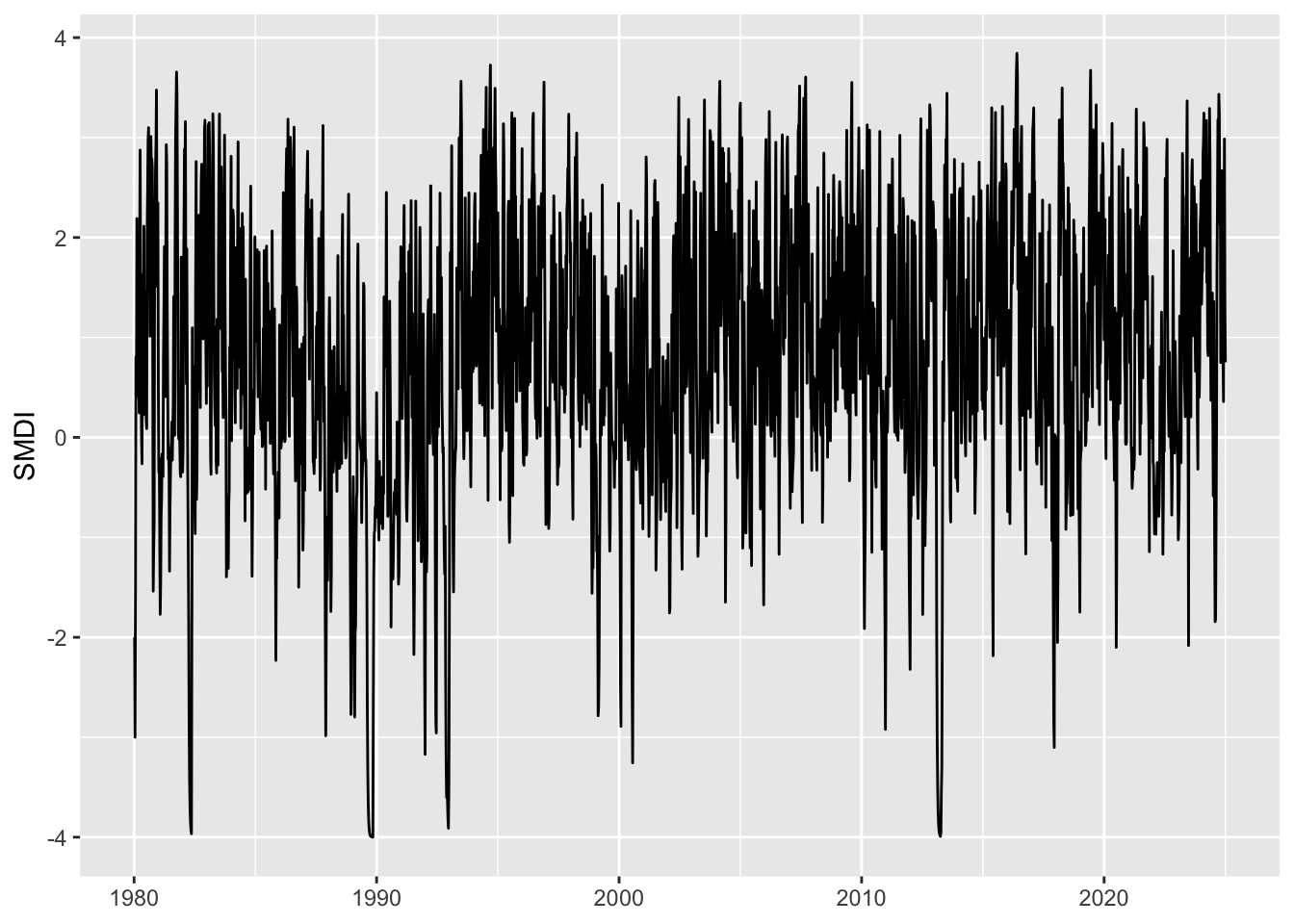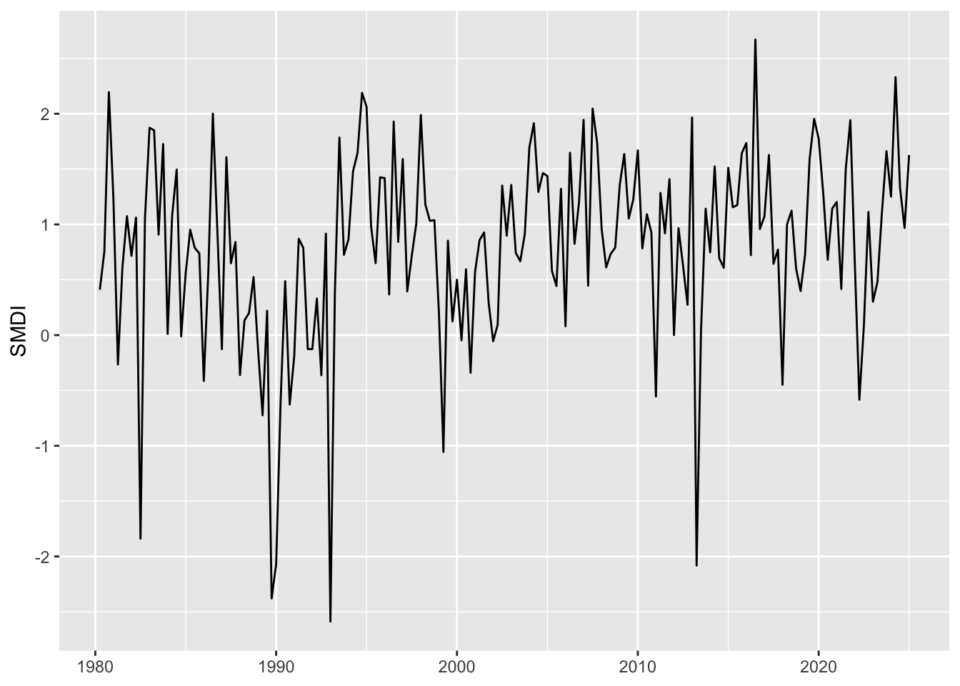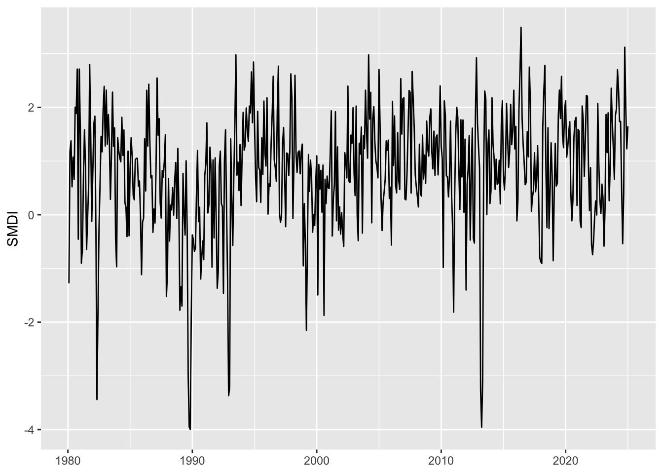 Obviously, we are not restricted to plots showing temperatures. Let us visualize the evolution of the SMDI between 1987 and 2024, on a monthly basis. Note that the spatial aggregation has flattened the series (recall the monthly values before spatial aggregation range between -4 (very dry) to +4 (very wet)).
