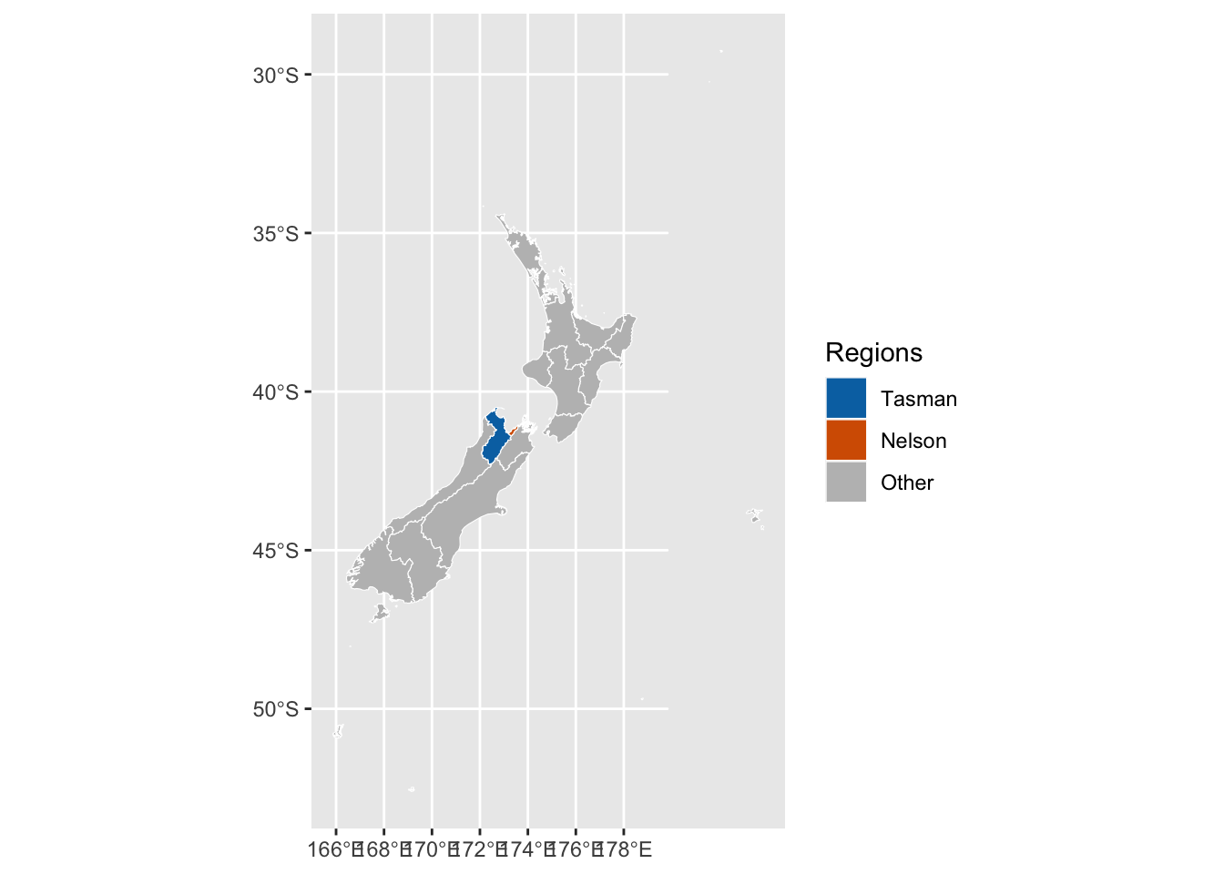 # Areas of each regionnz_areas <- maps_level_1_NZ |>filter(NAME_1 %in%c("Tasman", "Nelson")) |>mutate(area_m2 =st_area(geometry)) |>st_drop_geometry() |>mutate(area_m2 =as.numeric(area_m2)) |>select(region = NAME_1, area_m2)nz_areas