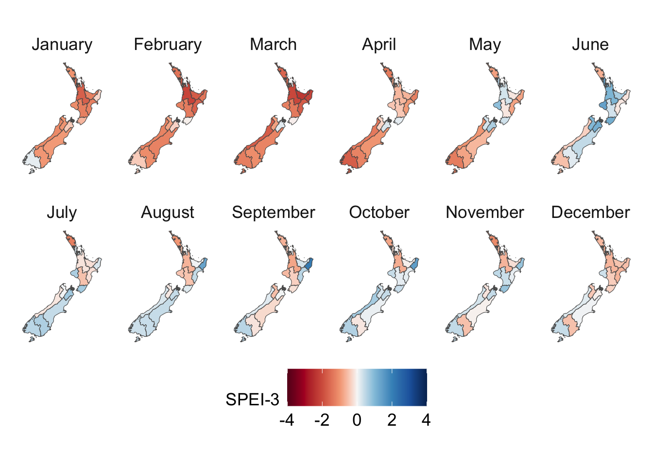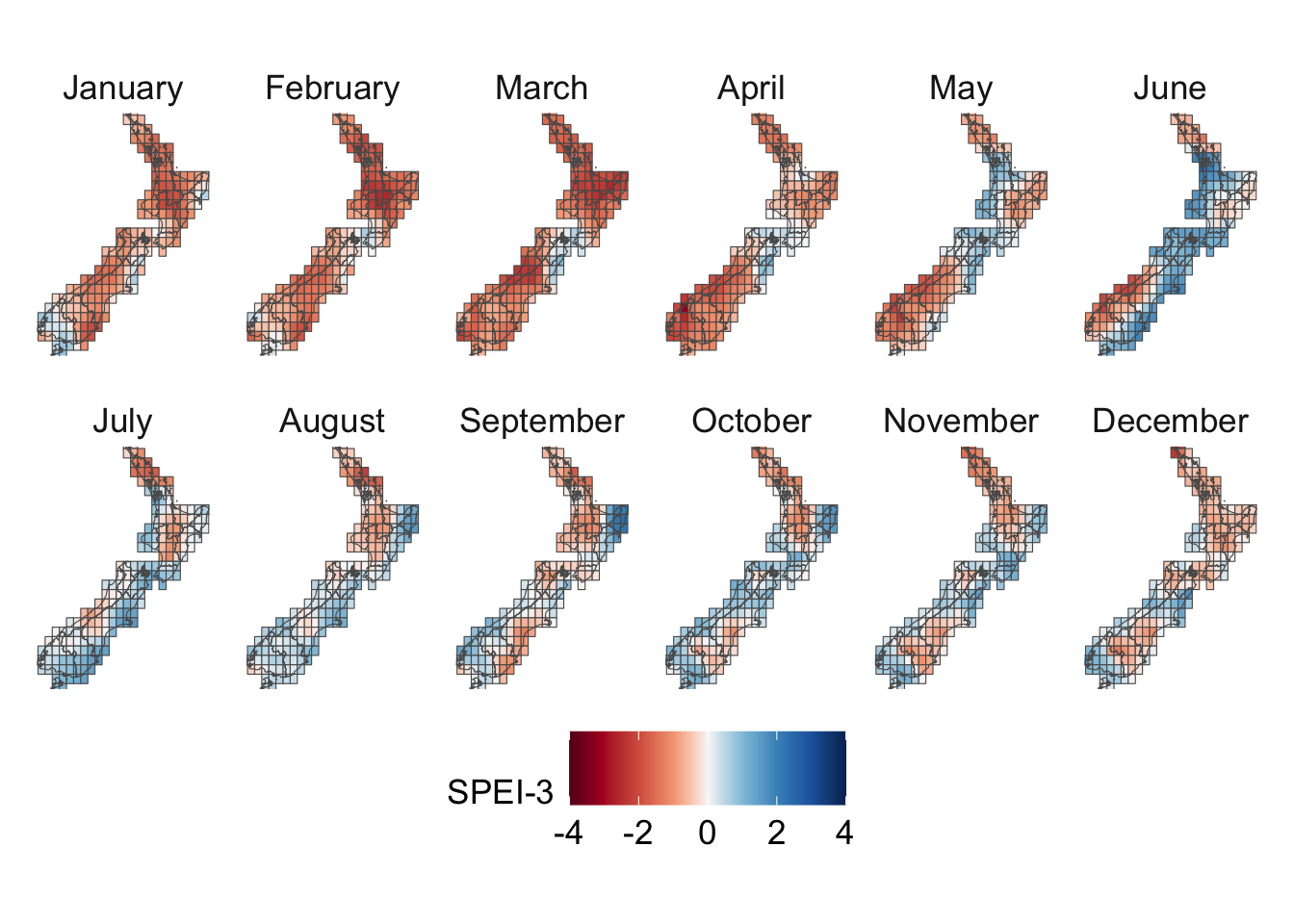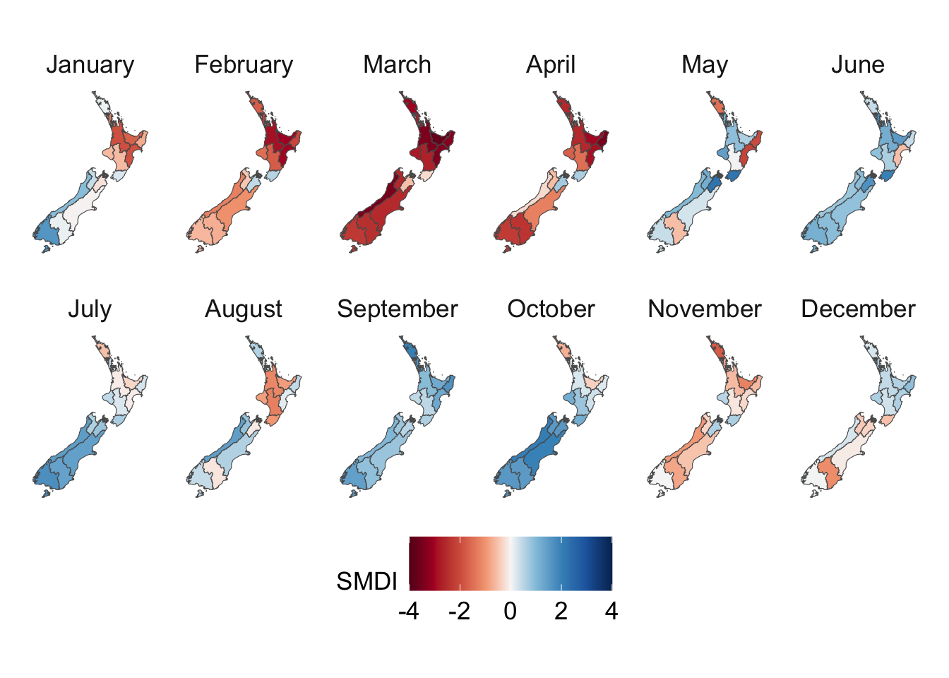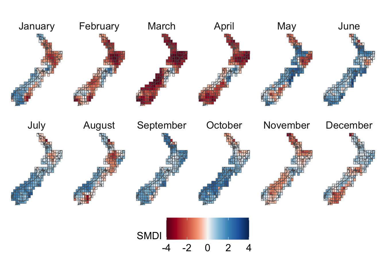 Figure 5.35: Soil Moisture Deficit Index in New Zealand, monthly basis.