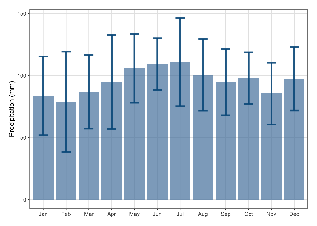 Figure 5.34: Barplot of precipitation in New Zealand on a monthly basis (1987–2024).
